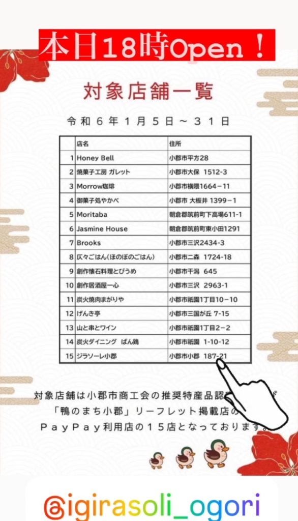 対象店舗:小郡市商工会の推奨特産品認定のPayPay利用店15店となっております♪