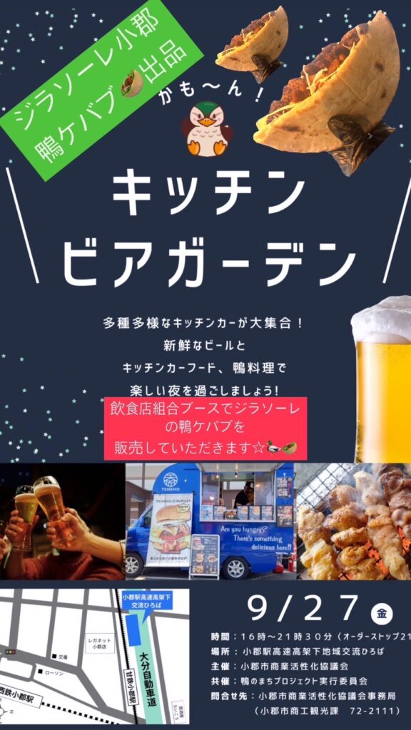 お知らせ ジラソーレ小郡2024年9月25日2024年9月19日 9月27日(金) 16時~21時30分 小郡駅高架下地域交流ひろば 小郡市「かも~ん!キッチンビアガーデン」キッチンカーが大集合!鴨料理も 9月27日(金) キッチンビアガーデンに出店します♪
