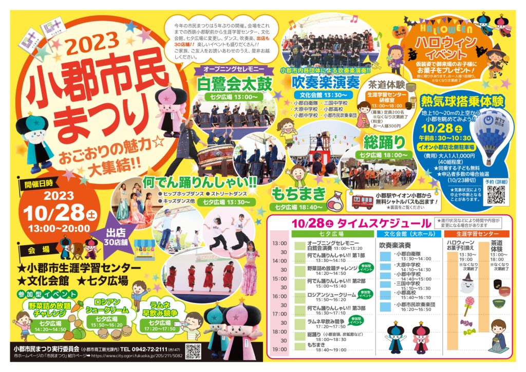 お知らせ ジラソーレ小郡2023年10月28日2023年10月28日 10月28日(土曜日)午後1時〜8時 会場:生涯学習センター、文化会館、七夕広場 ぜひお気軽に遊びに来てください♪ 10月28日(土)小郡市民祭りにキッチンカー出店!!